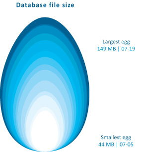 The top graph shows cumulative growth in the number of nodes gathered over time – the total number of nodes is around 32,000 as of 19 July. For the eggs, I used the size (in MB) of the output file. Honestly, folks, it doesn’t really matter if I’m looking at megabytes of storage or number of nodes. This absolute size approach is analytically vacant – it does not help me determine done-ness of crawling activity. It tells me that the crawler is still gathering new nodes that pass the food blog test. Yes, I already knew that.
